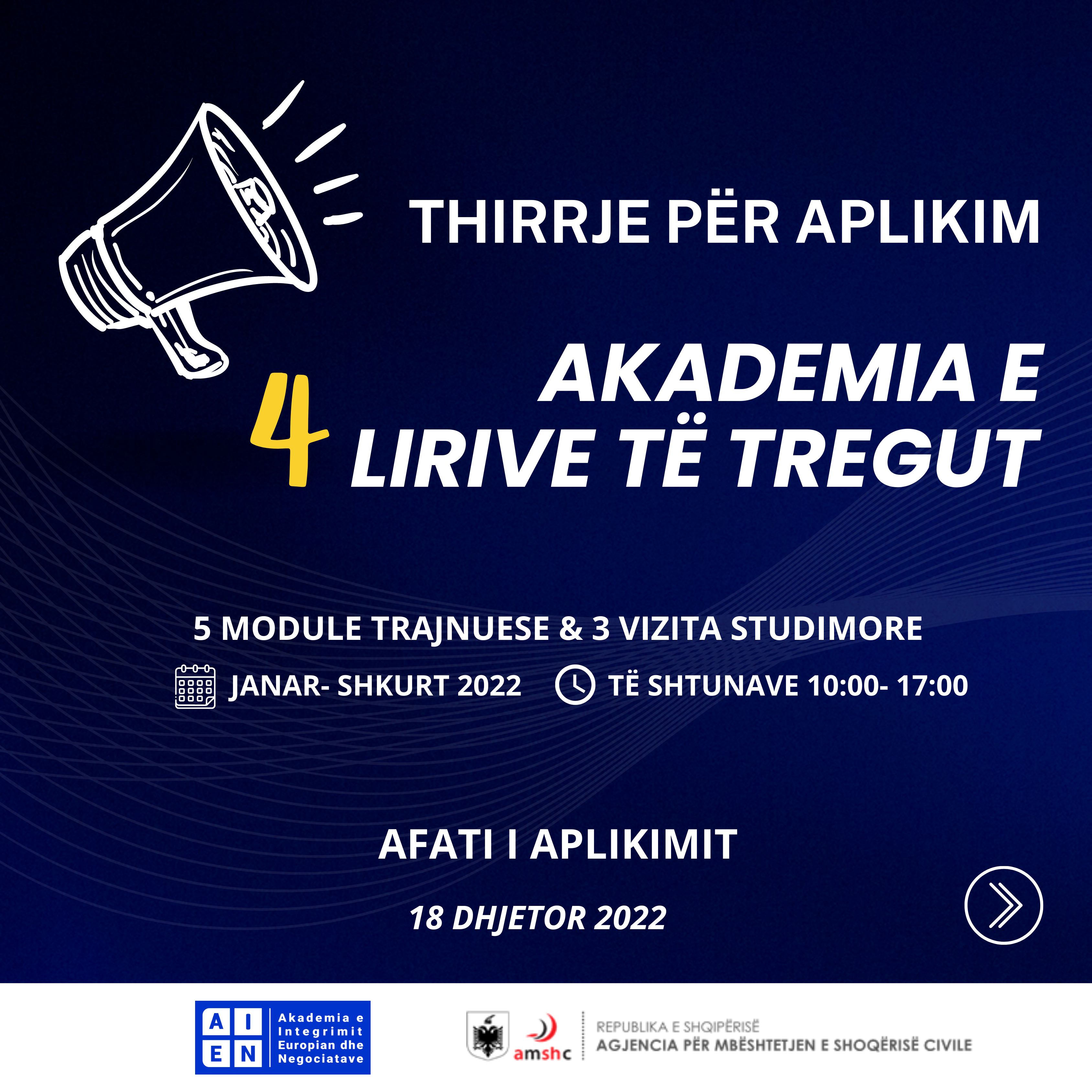 Nëse jeni të interesuar mund të aplikoni duke dërguar CV dhe Letër Motivimi (në shqip ose anglisht) me subjekt: “Aplikim Akademia 4 Liritë” në adresën e emailit: [email protected]